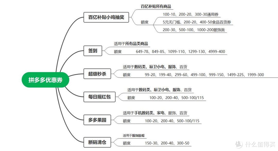 由于我基本上都是在爆料拼多多的数码3c类商品,偶尔也有服饰鞋帽,所以本文涉及到的商品品类也仅限我熟悉的这些哈,先来一张拼多多主要活动的导图,这样大家一看就比较清晰明了,然后我再挨个介绍每一个活动的细节: