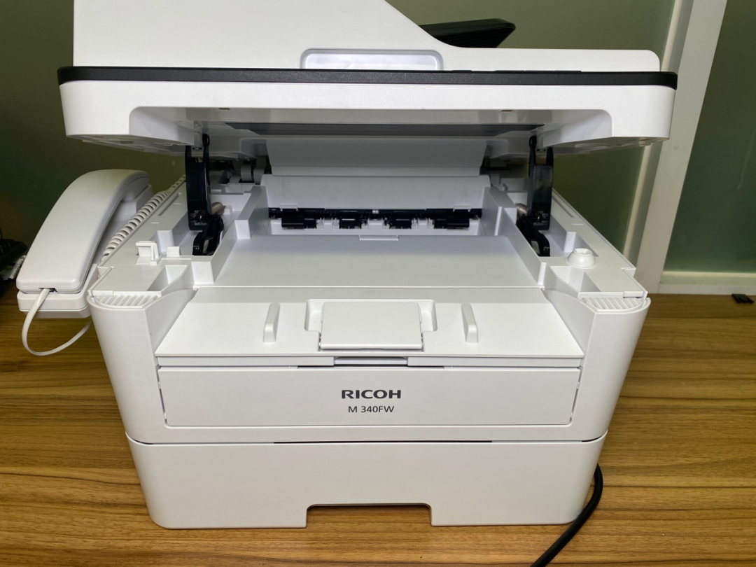 ricoh m 340fw外观设计简洁大方,功能紧凑,比同等级传真一体机的桌面站定面积小。