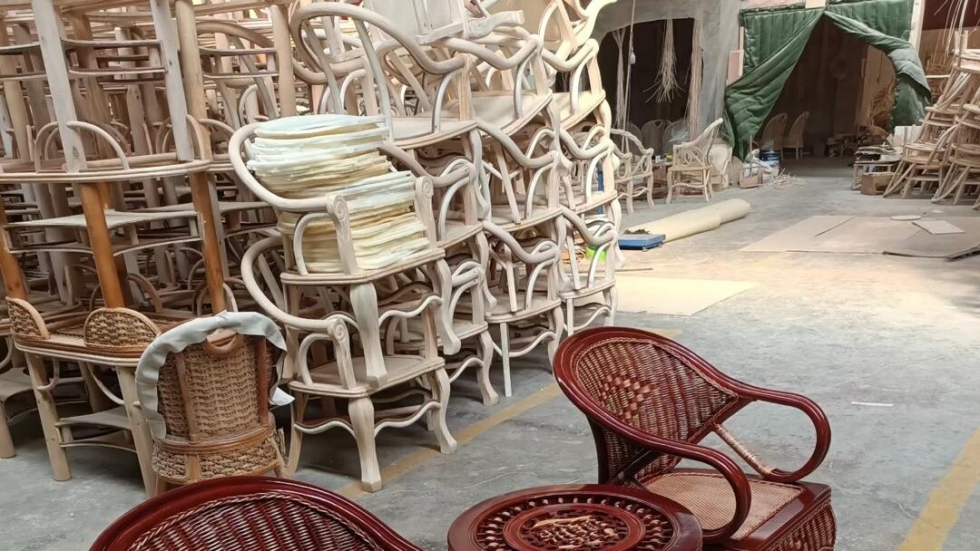 根据了解,大多数这样的小型加工作坊,基本都是从上游厂家去拿加工用到的原材料,包括焊接好的框架和藤条,后期加工也只是负责一些简单的编织和组装工作,比起同等类型的小型加工业,几乎是不需要门槛就能去做的。